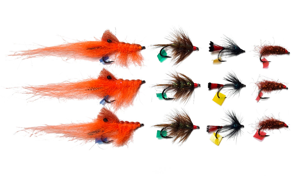 Die Fliegensets unterscheiden sich aufgrund der entsprechenden Etiketten leicht voneinander und auf der Rückseite der Blister-Verpackungen befinden sich nähere Produktinformationen und zusätzlich ein QR-Code, der zwecks weiterer Infos zu unserer Internetseite (www.oft-flies.com) führt.
