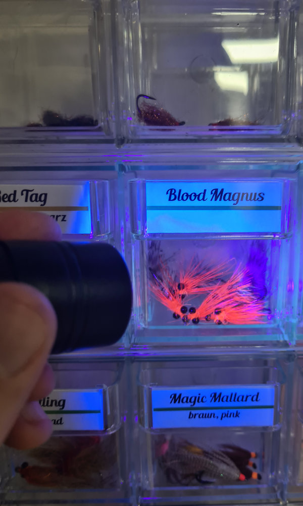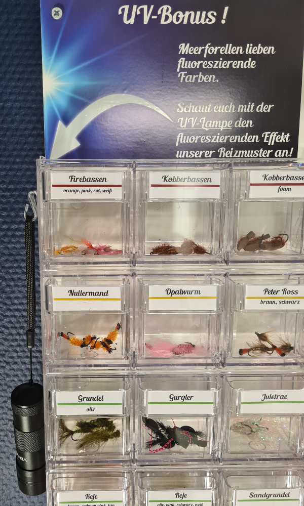 An dem Einzelfliegendisplay ist eine UV-Lampe angebracht, die von den Kunden eigenständig benutzt werden kann. So kann sich jeder die fluoreszierenden Farben der Reizmuster und der Muster mit Bisspunkten anschauen und sich selbst von den Vorzüge unserer uv-aktiven Fliegenmuster überzeugen.