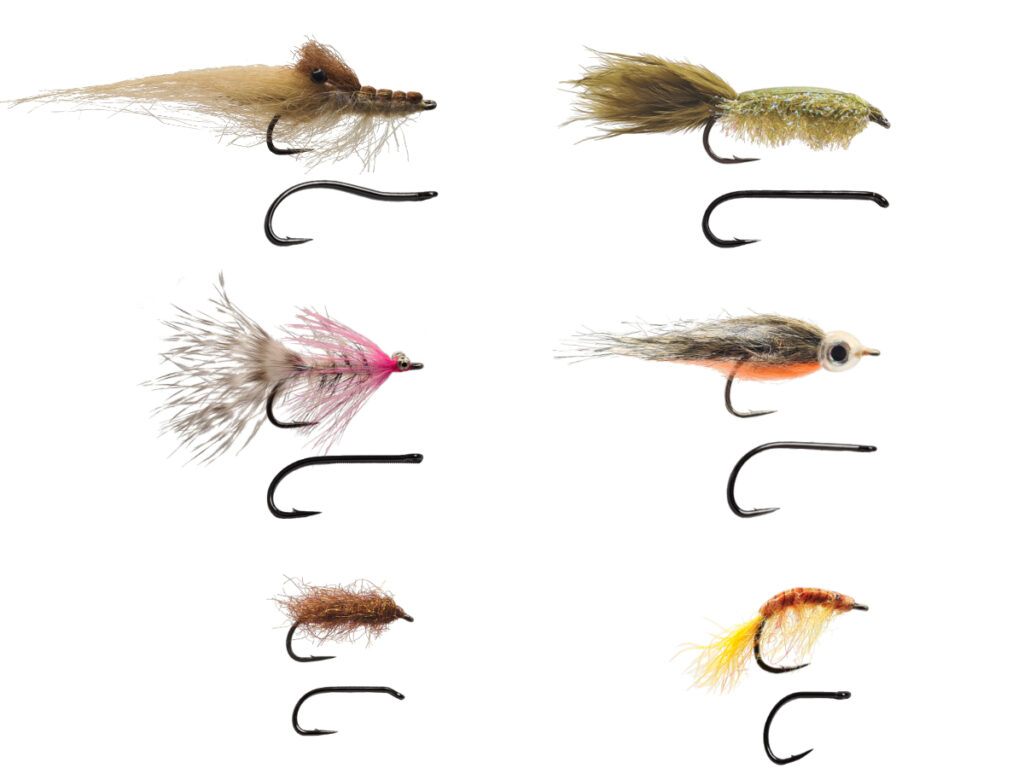Auffällige reizende Fliegen (links) sind beim Angeln auf Meerforelle genauso wichtig wie natürlich gehaltene Muster (rechts). Zusätzlich zu diesen beiden unerlässlichen Kategorien gibt es bei uns jedoch auch natürlichere Muster mit dezenten Reizaspekten (Mitte) – so ist definitiv das Richtige dabei!