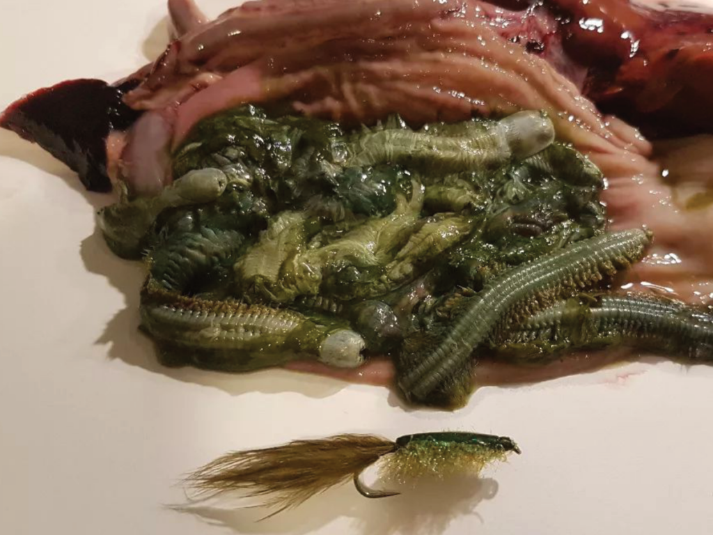 Ein optimal gewähltes Beuteimitat kann man auf dem ersten Bild sehen. Die gefangene Forelle war voll mit Seeringelwürmern, die dem fängigen Köder (olive Wurmfliege) sehr ähnlich sahen.